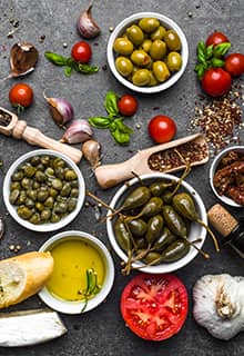Відмінною рисою середземноморської кухні є те, що страви готують переважно зі свіжих інгредієнтів, вони не надто важкі для травлення та чудово смакують. На родючій землі вирощують великий асортимент чудових овочів, а також виготовляють якісну оливкову олію та багато видів спецій. Все це сприяє здоровому й різноманітному харчуванню. В кожному місті види спеції та оливкової олії різні.